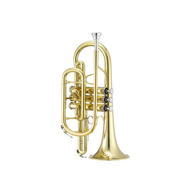Cornetta in Sib / Intonazione: Sib / Campana: diametro 120 mm / intarsi in Pearloid sui bottoni dei pistoni / Poggiadito slide primo pistone / Astuccio / Bocchino / Panno di pulizia e accessori / Campana: Ottone, laccato / Canneggio: 11.68 mm / Cannello: Ottone ramato, laccato / Pistoni: Acciaio ionx / Anello pompa terzo pistone regolabile/ Astuccio light JUPITER : JPKC28Q